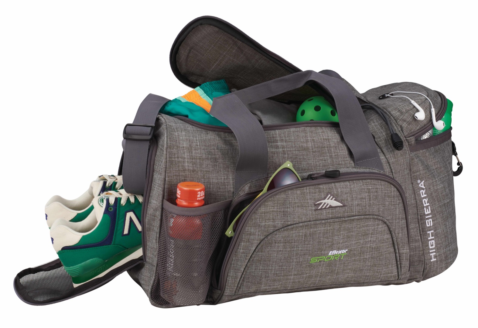DescriptionThe High Sierra Switch Blade Sport Duffel Bag includes a large main compartment with U-shaped opening and an end media pocket with a headphone port. Store wet clothes in the mesh wet compartment, which rolls up when not in use. This sport duffel includes a zippered front pocket and elastic shock cord and large clip to attach extra gear. The High Sierra Switch Blade Sport Duffel Bag is easy to carry with an adjustable shoulder strap and includes a lifetime warranty.